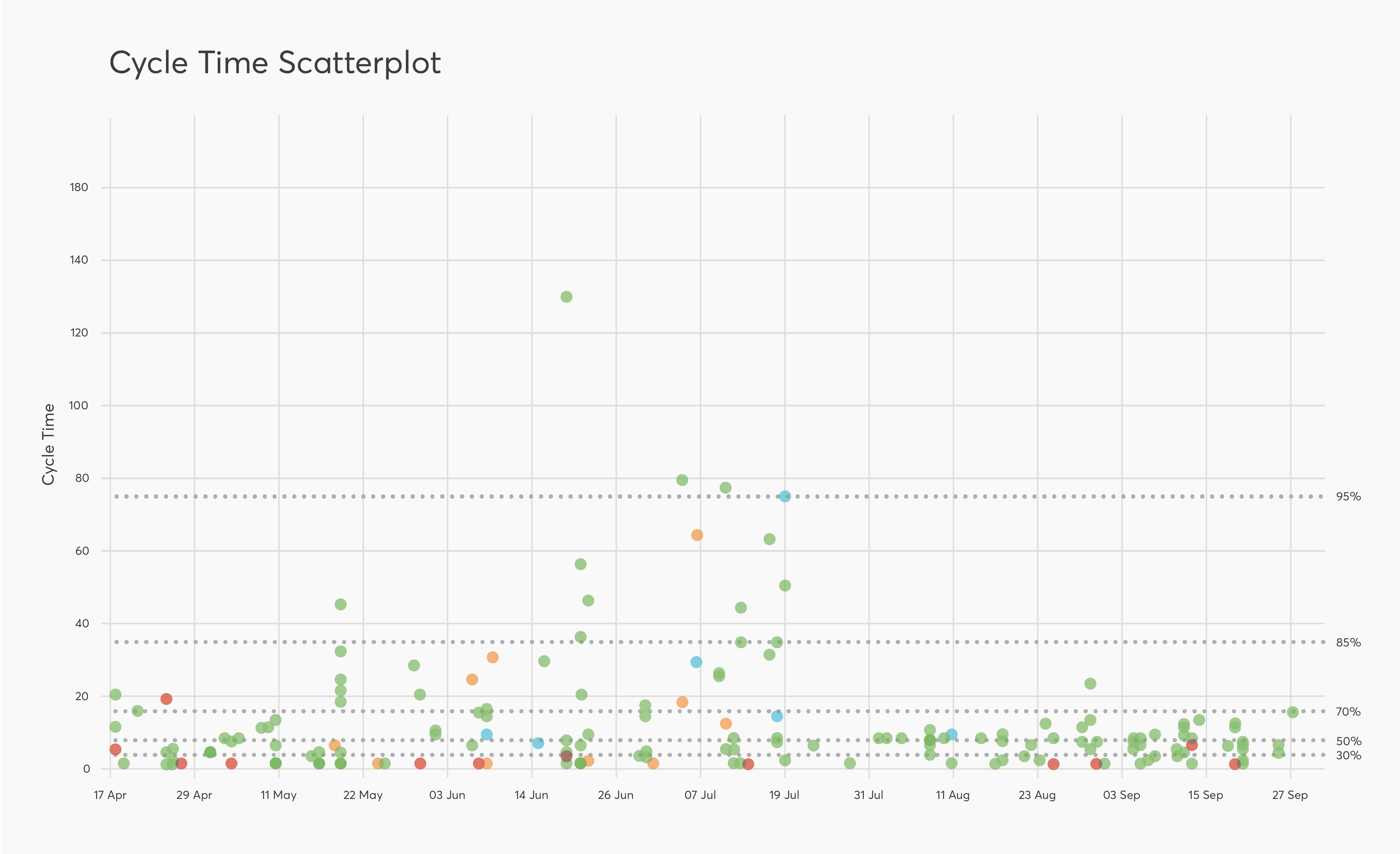 By looking at how fast tasks have been completed in the past, you can make predictions about your future performance. The cycle time scatterplot can be used to give both an estimated time of a single task completion and the probability of that commitment being met.