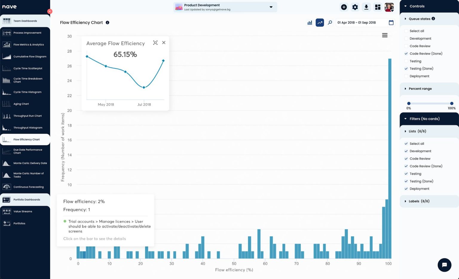 Use the Flow Efficiency chart to measure your average flow efficiency and see how the trends move over time. To specify which states on your board you consider to be inactive, select them on the right sidebar.