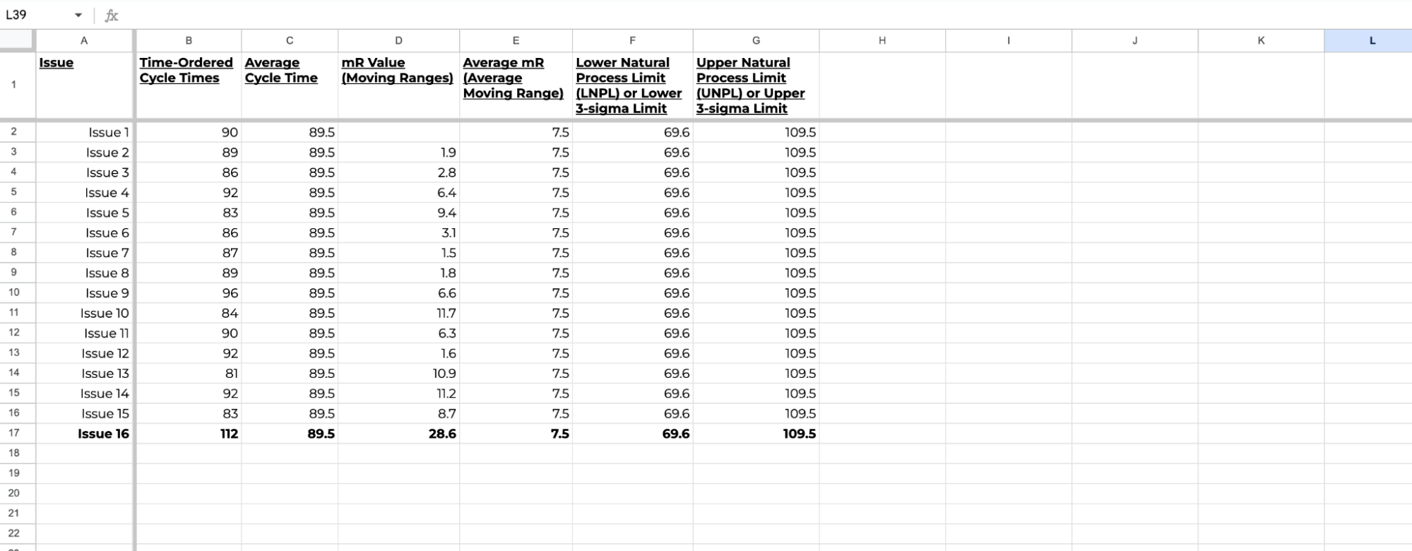 3. Calculate the Moving Range: In the next column, calculate the difference between each pair of consecutive data points. This shows how much variation there is from one completed item to the next.