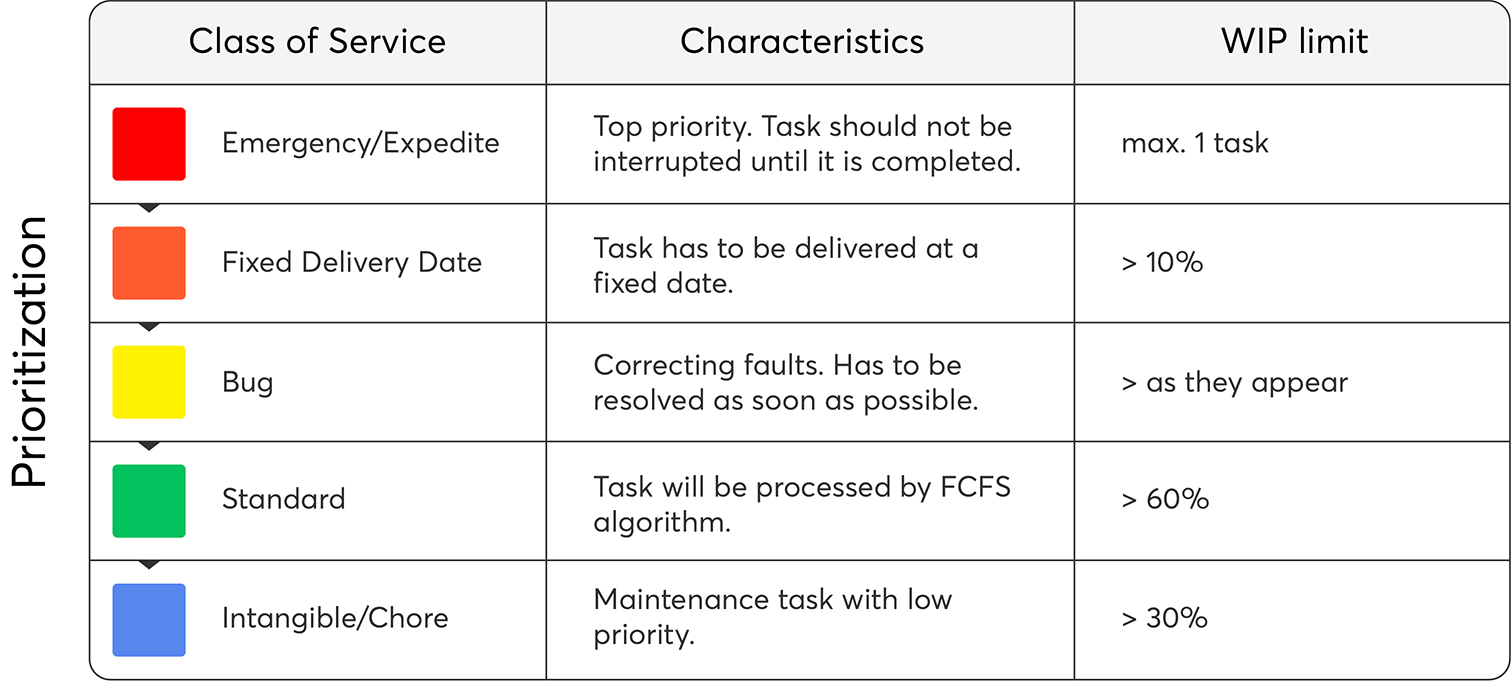 The first step to implementing Kanban rules is to define your Classes of Service and their priority levels. You could define your own classes of services depending on your project. Most Kanban teams have between three and five. Some popular CoS are: