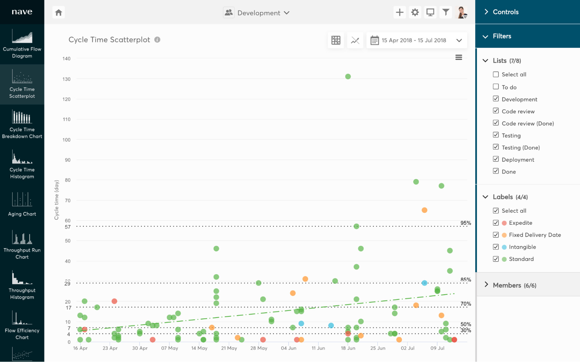 Let’s analyze a few scenarios. The Cycle Time Scatterplots are of great help when it comes to cycle time and lead time analysis. They provide information about how quickly and consistently we deliver results to our customers.