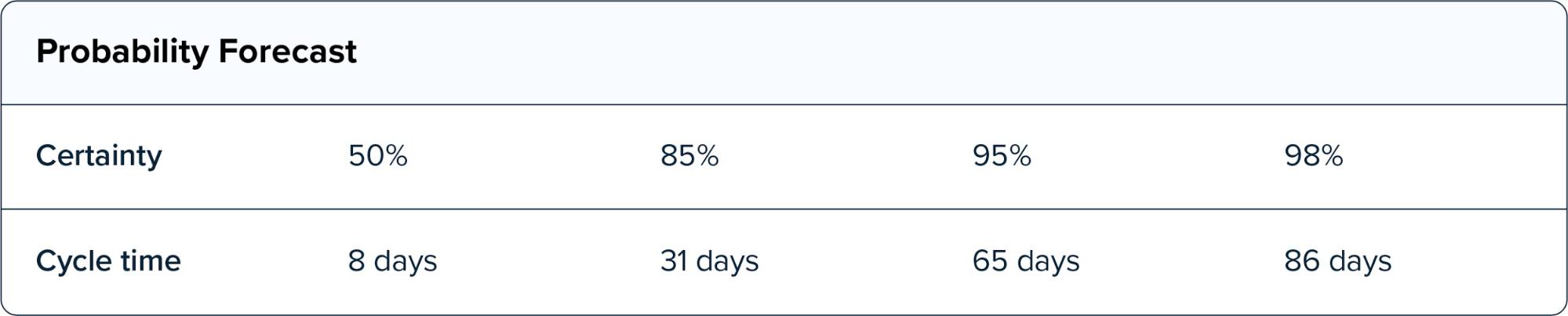 Using the percentiles on your Cycle Time Histogram, you can perform a probabilistic forecast. Essentially you define a range of cycle times and the probability that comes with each of them.