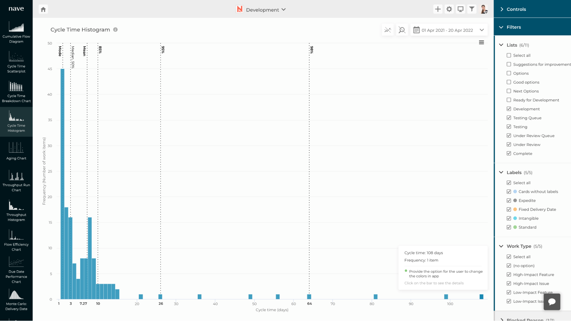 Here at Nave, we track your cycle times by processing the card activities on your board. So, if a work item has a cycle time of 108 days, what this means is that the elapsed time between the moment the card entered your workflow and the time when it exited it is 108 days. In practice, you needed 108 days to deliver that particular work item.