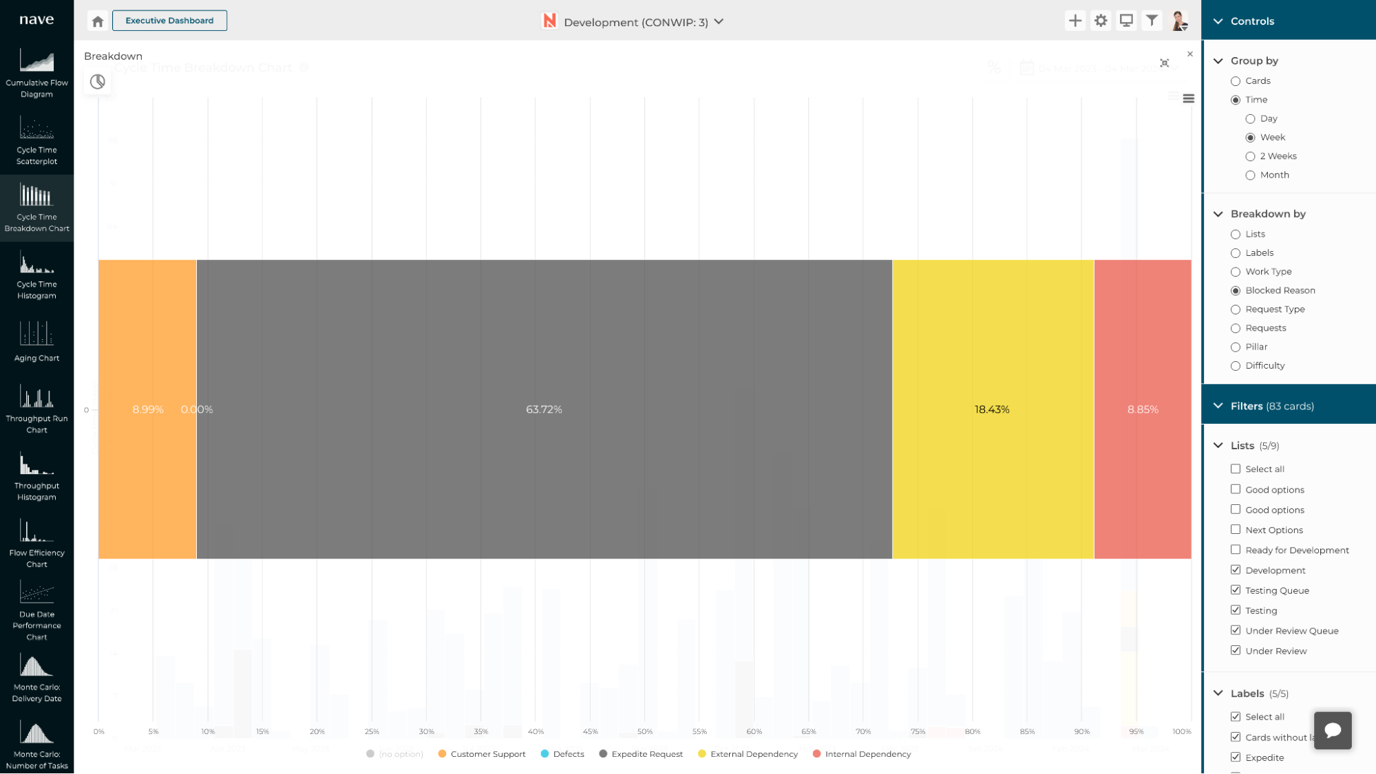 The above cycle time breakdown shows that 64% of the blocked time is being caused by Expedite Requests. This group is the most impactful one of the blockers that cause delivery delays.