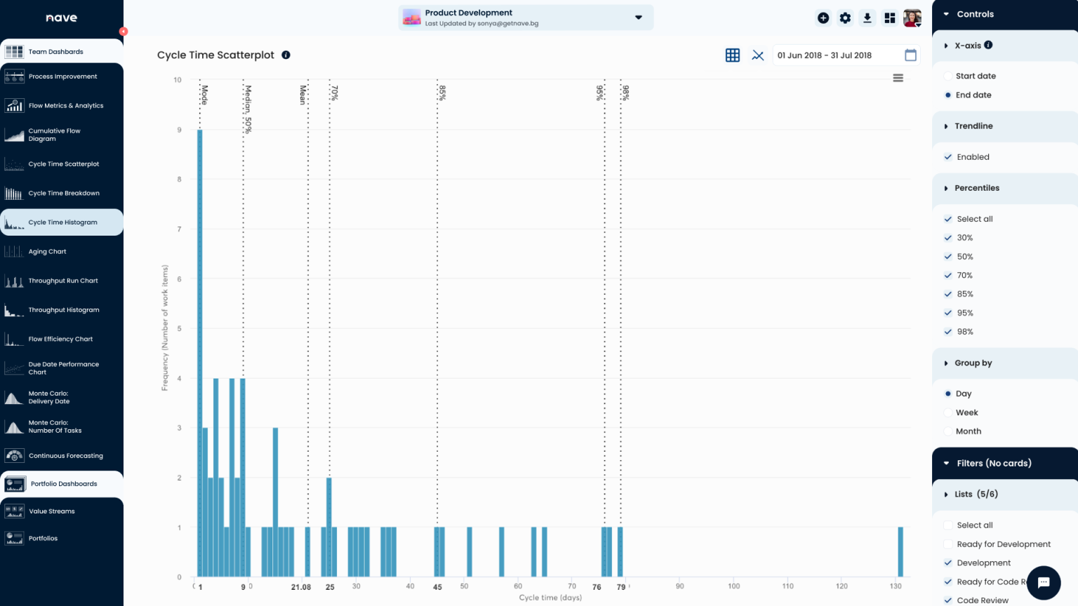 A Cycle Time Histogram with a big hump on the left and a very long tail to the right indicates that your cycle times vary significantly. This means that your process is inconsistent and you’re maintaining an unpredictable system.