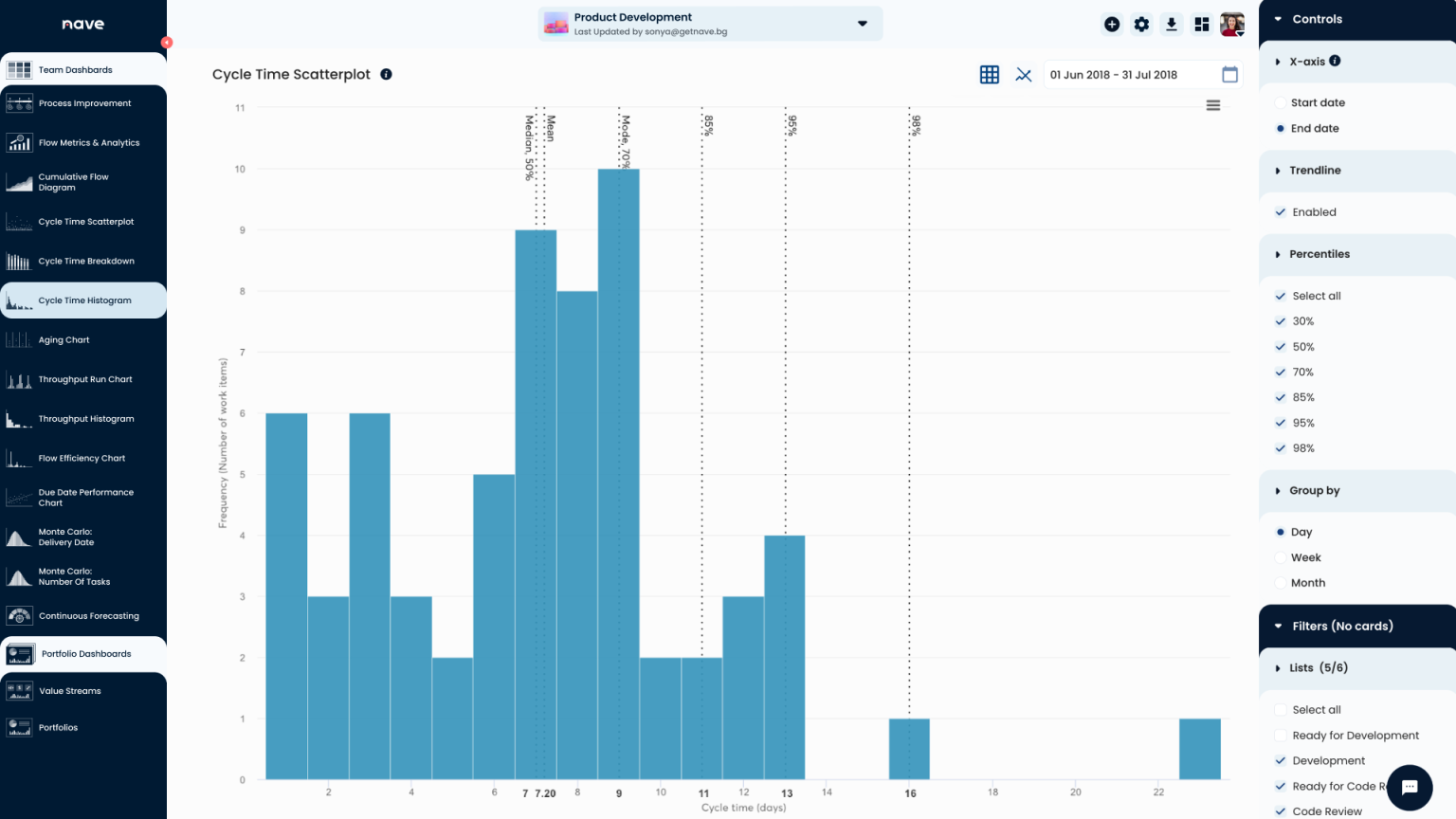 Using their frequency distribution, this team can say that there is a 50% chance of finishing any work item in less than 7 days.