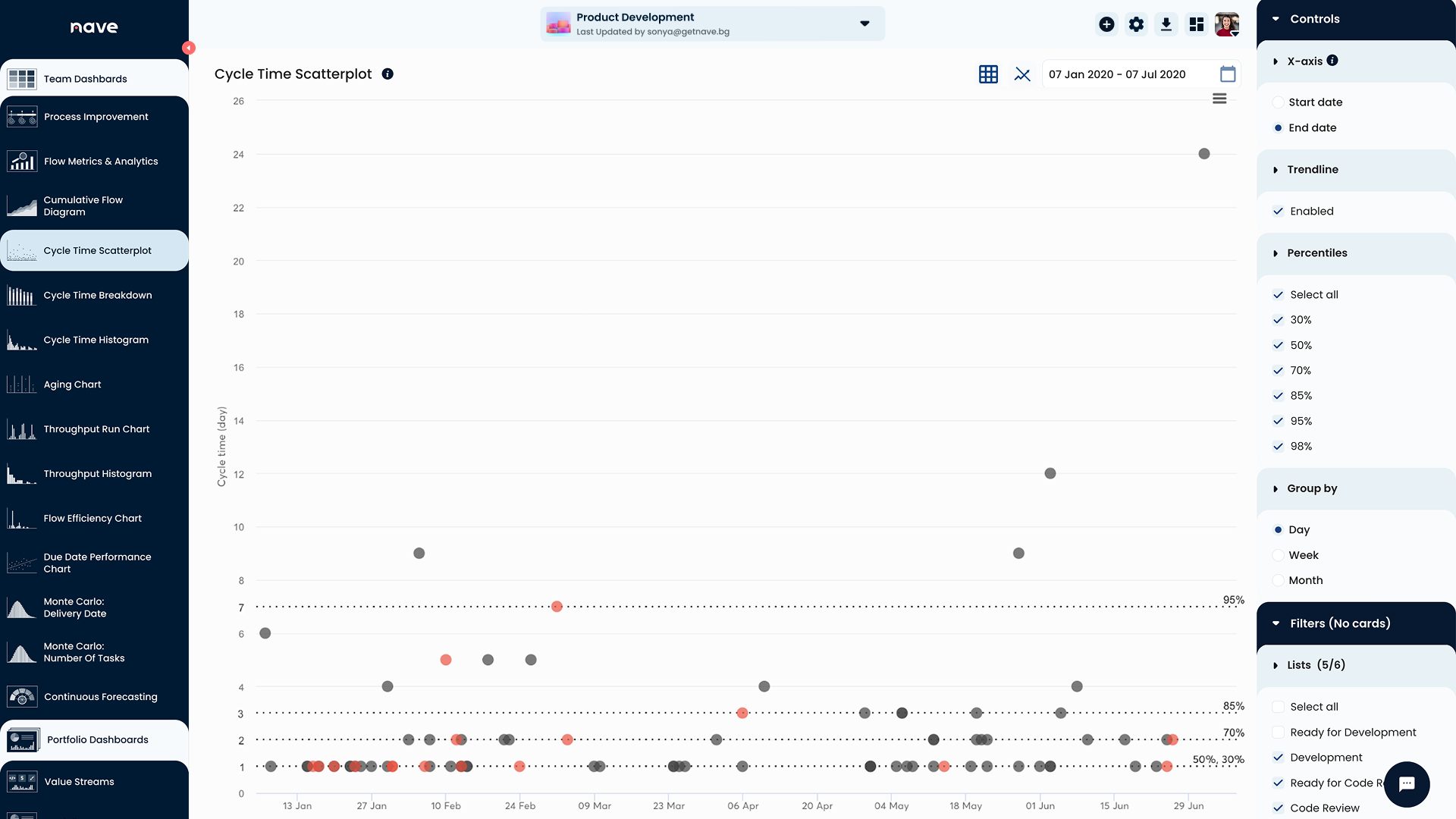 Use the Throughput Run Chart to filter your work by failure demand and track how the levels change over time. The green line illustrates how failure demand trends have developed. Ideally, the line should decrease smoothly – this means you’ve been effectively reducing failure demand in your system.