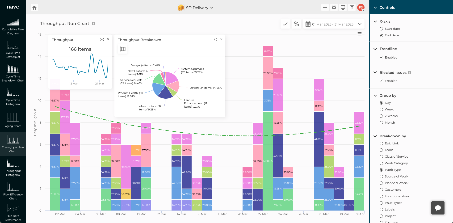 For example, when he realized that half of his team’s throughput comes from unexpected work, Paul started to ask questions such as “why is unplanned work at large?” He then used Nave to filter down the unplanned items and breaks them down by work type to see where the majority of interruptions come from. This helps him have discussions with other departments to find ways to mitigate these interruptions.